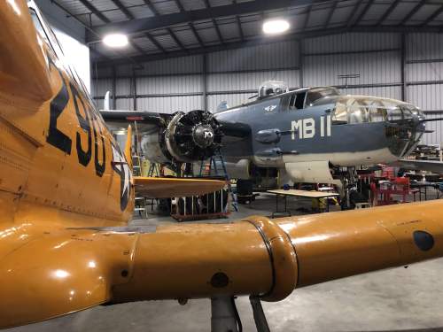 The PBJ bomber’s starboard engine has been re-hung and is being prepped for testing. Both props just got checked and are on a holding stand on the left.