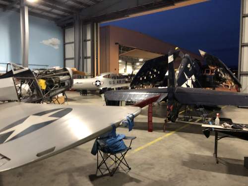 It’s the off season for air shows and most of our ride programs. It’s time for annual inspections and maintenance. After hours tonight the new hangar had a large party going in it (event location rentals are a significant source of our operating revenue), the museum hangar was dark, but the maintenance hangar was still bustling with activity.