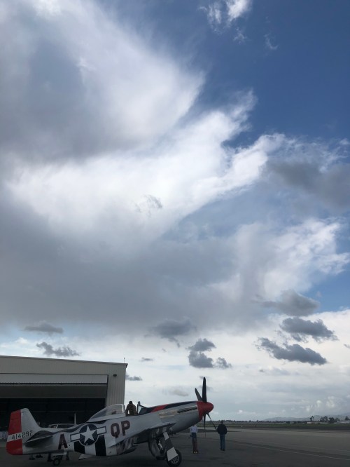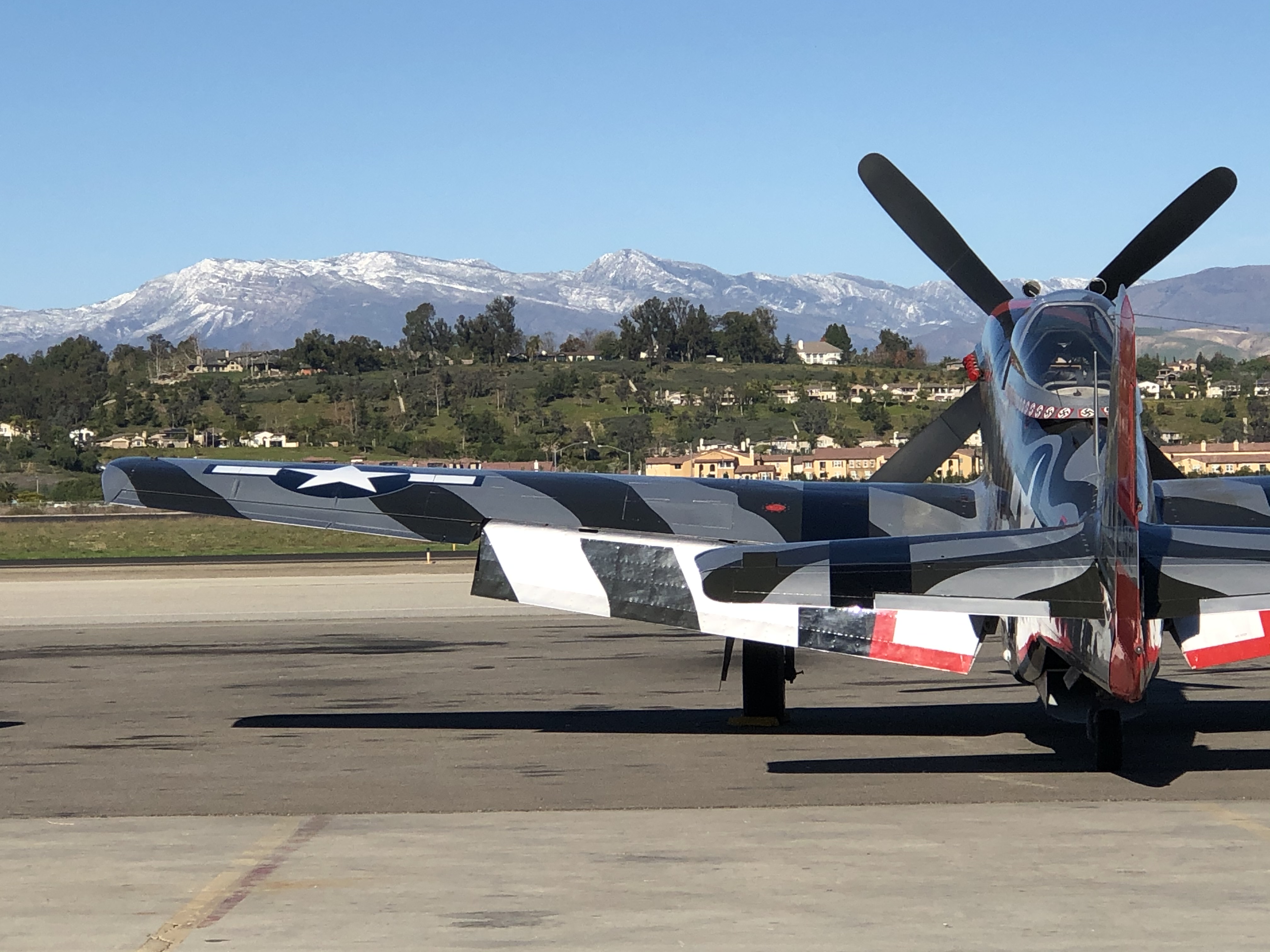 There was a winter storm earlier last week (another one moving in tonight) and the snow level dropped down to about 3,000 feet. The mountains north of Camarillo go up well above that, so they got fresh snow. But yesterday was cloudless, “clear and a million” in flying parlance, and our P-51 Mustang was out on the ramp…