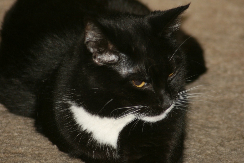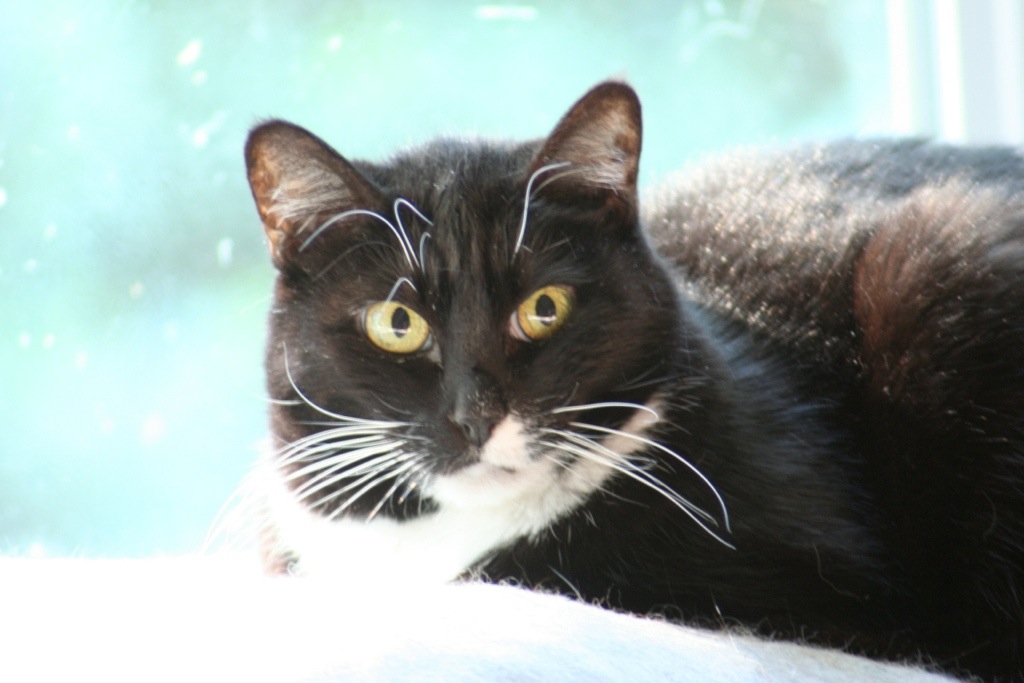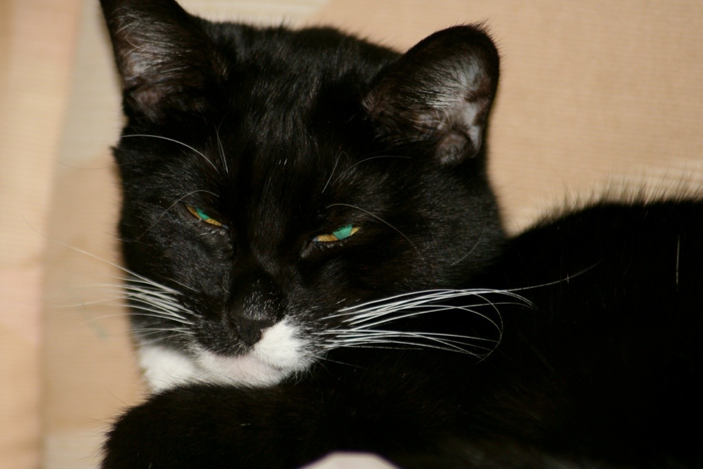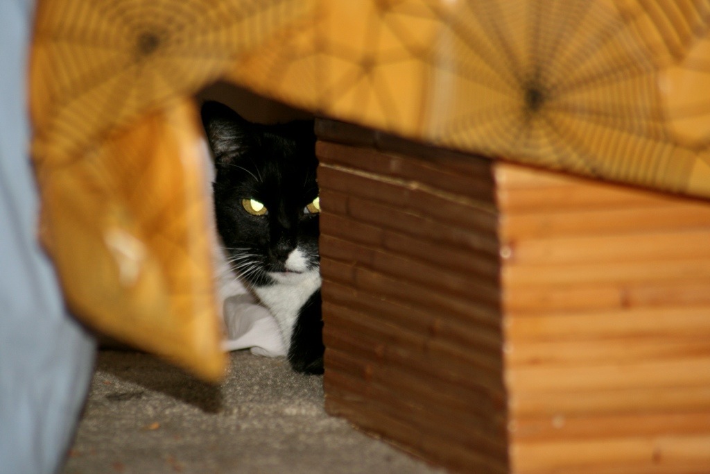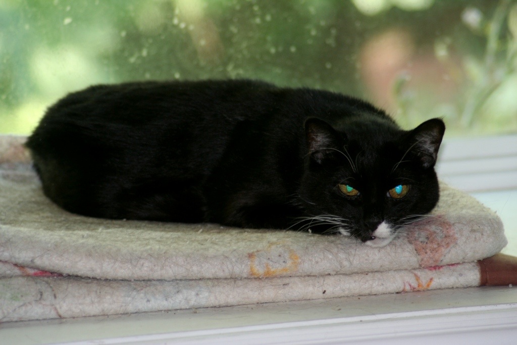 - My desk sits next to a huge bay window, which is marvelous most of the time. I love the view of the backyard. But with the current cold snap in Los Angeles, this thing just bleeds cold air right on top of me. (Yes, it’s got double pane, insulated glass.) So I hung a blanket up across the window to shield myself from the frigid air, and it works pretty well. Except the cat’s favorite sleeping spot is in the bay window. For three days she’s been baffled by the blanket, but tonight figured out how to sneak around the corner and into the window. Then all of a sudden I see her head sticking out as she tries to figure out how to get back to me. It’s very cute. It’s a cat thing.