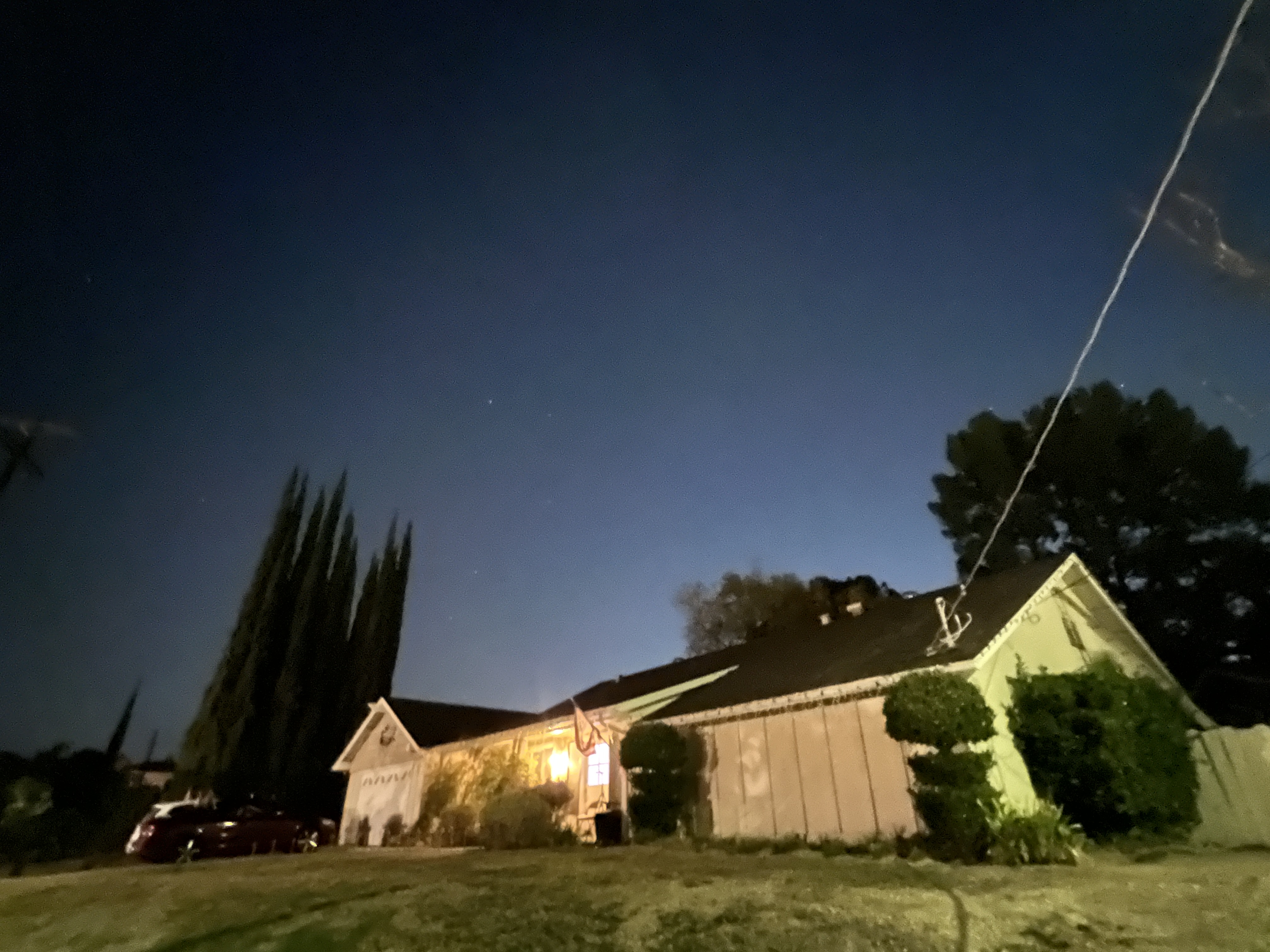 from the same spot as last night shows that the camera still sees plenty of light, primarily by taking a 30-second photo, where my regular, old eyeballs see the scene as being MUCH darker. With the Moon just rising over behind the house and the big, backyard tree, it’s just the porch light, the street light over my head, and a couple of neighborhood porch lights. In the end, that’s more than enough so that the darkness isn’t complete enough by any means to see many stars at all, while also not being bright enough to be of much good.