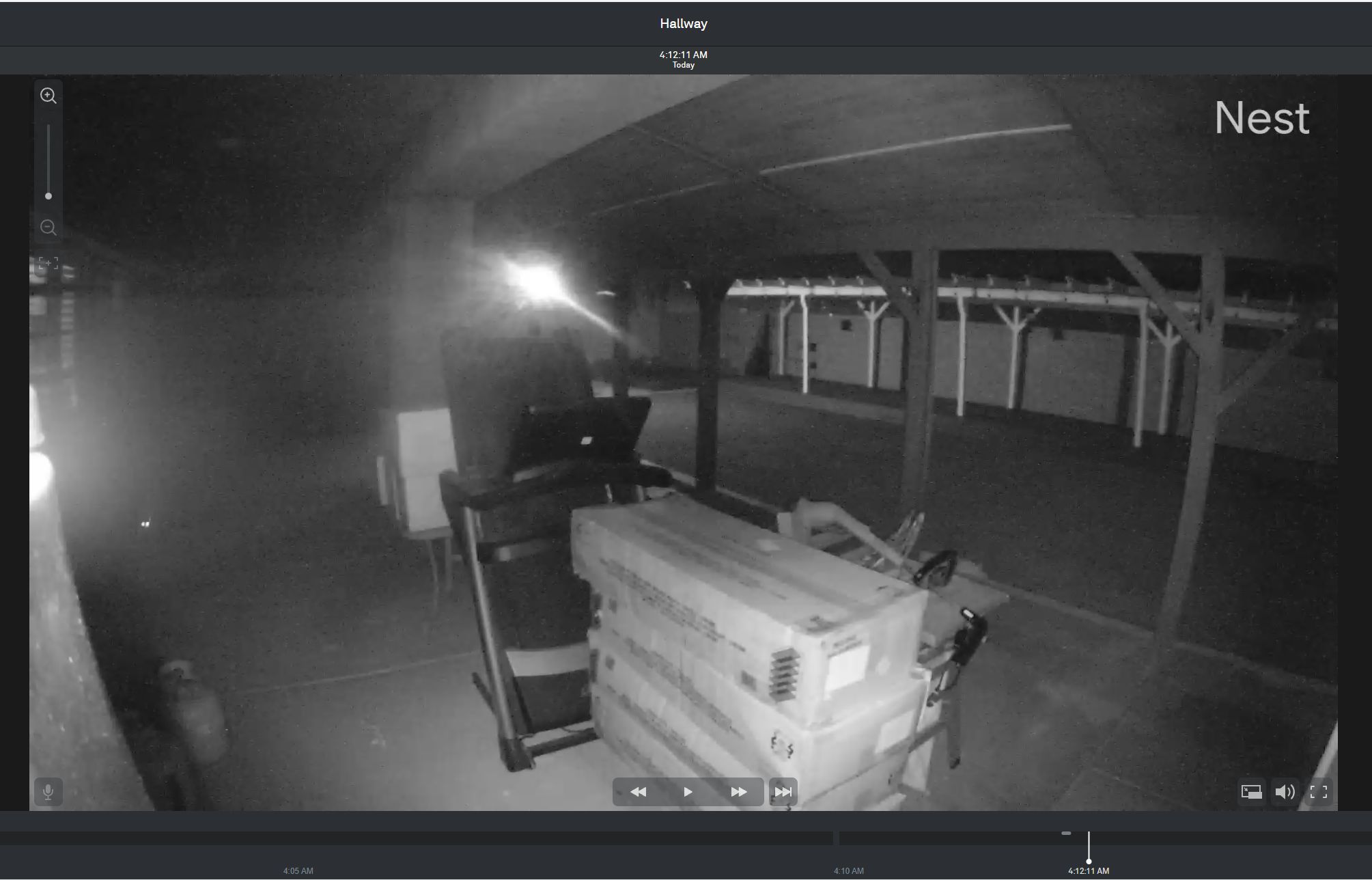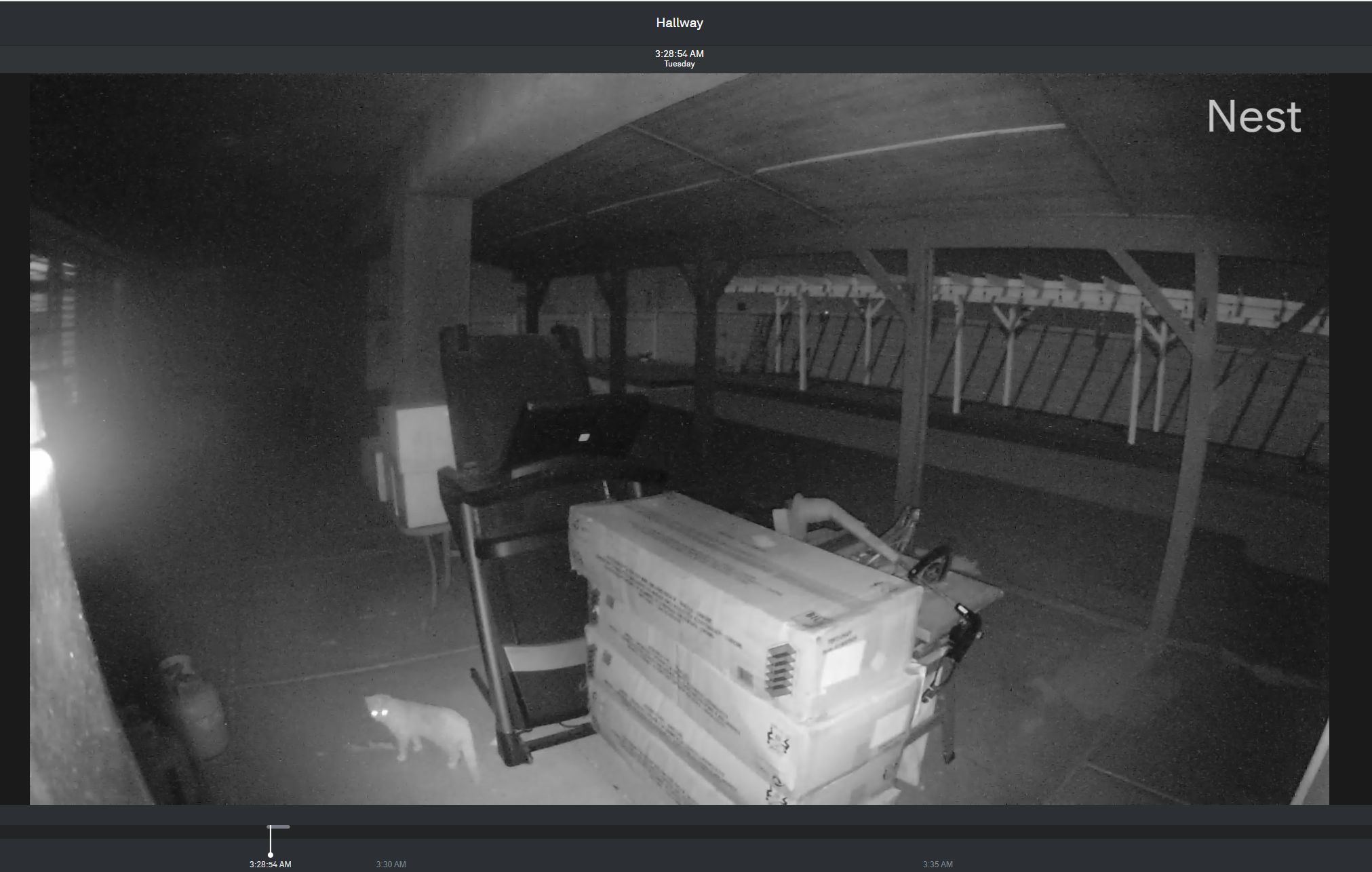 Three minutes later, just before the second security light activated on the right, the cat started investigating something around the treadmill that’s stored out on the porch. Big surprise!