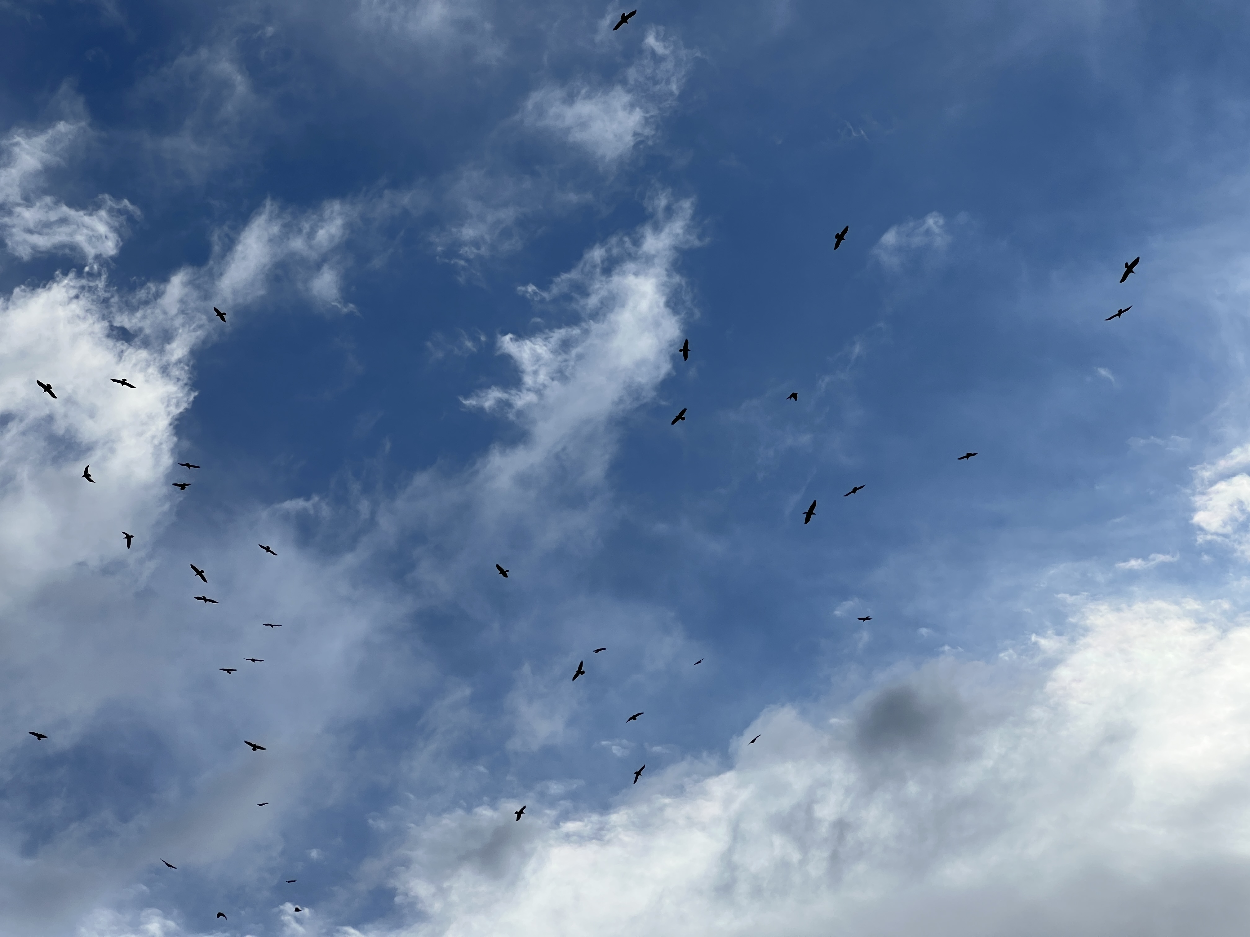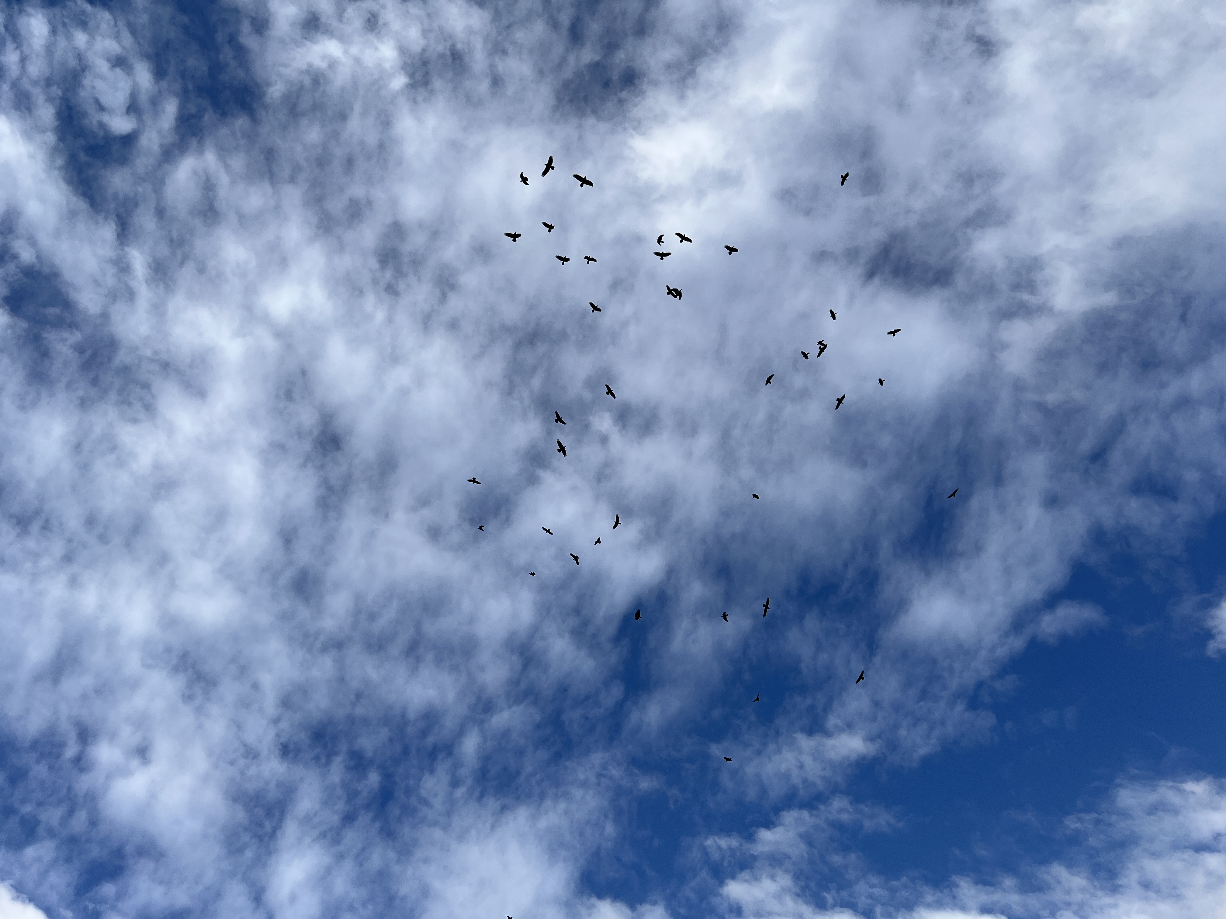 I was out in the back yard, refilling the bird seed feeders, when I heard a commotion overhead.