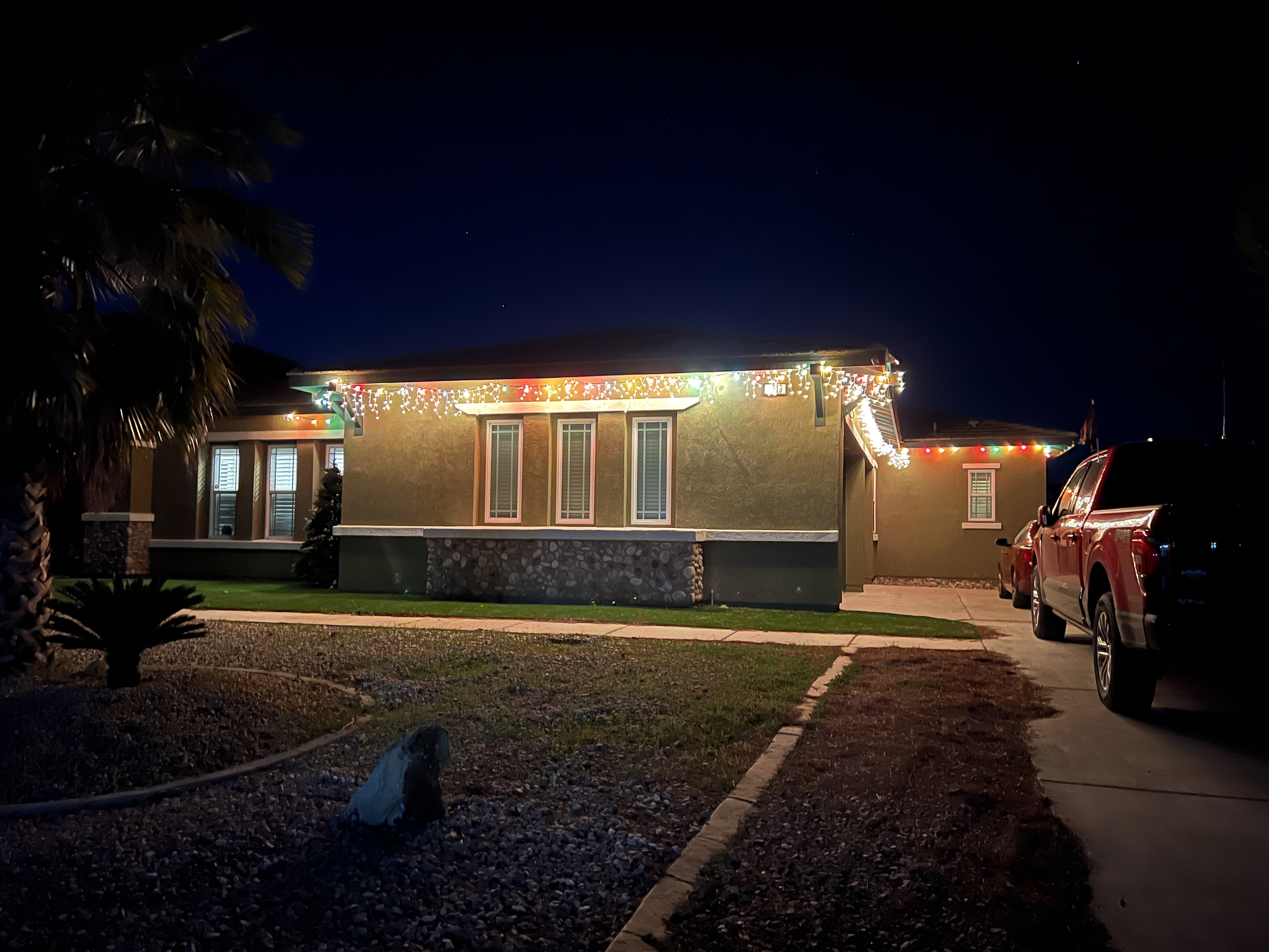 The other suggestion I’ve had is to put at least a few lights up on the back yard roofline and on the pergola. I’ve never done the back yard at either of the two previous houses, but here we have vacant lots behind us and the rear roofline and top of the pergola can be seen from the main road coming into the subdivision and a little bit from the main road. It wouldn’t be that hard…