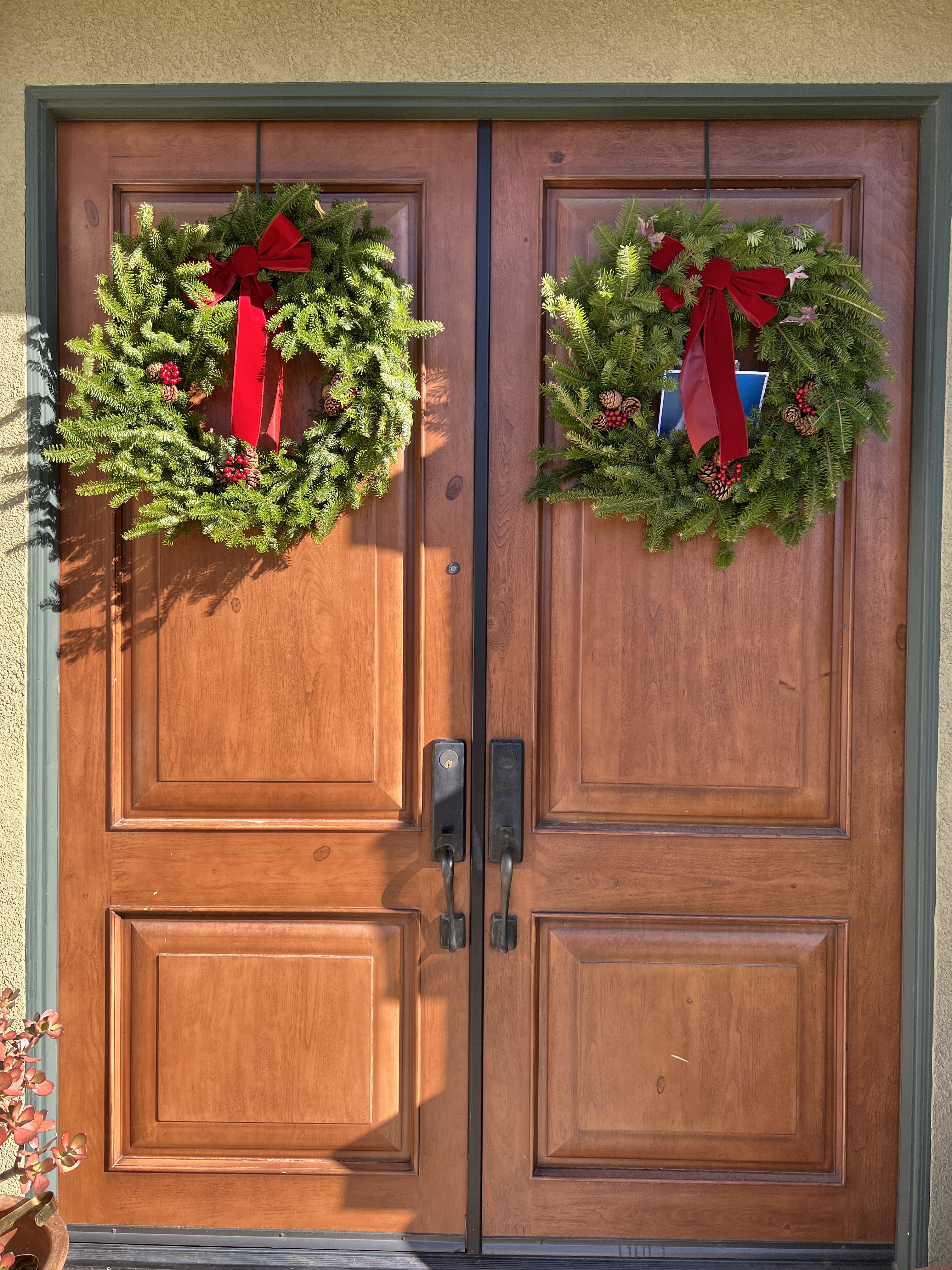 However, the wreathes came in, and like with our Pomelo house (from 7+ years ago) we again have two gorgeous wooden front door, each with a huge, all natural wreath from the Vermont Country Store.