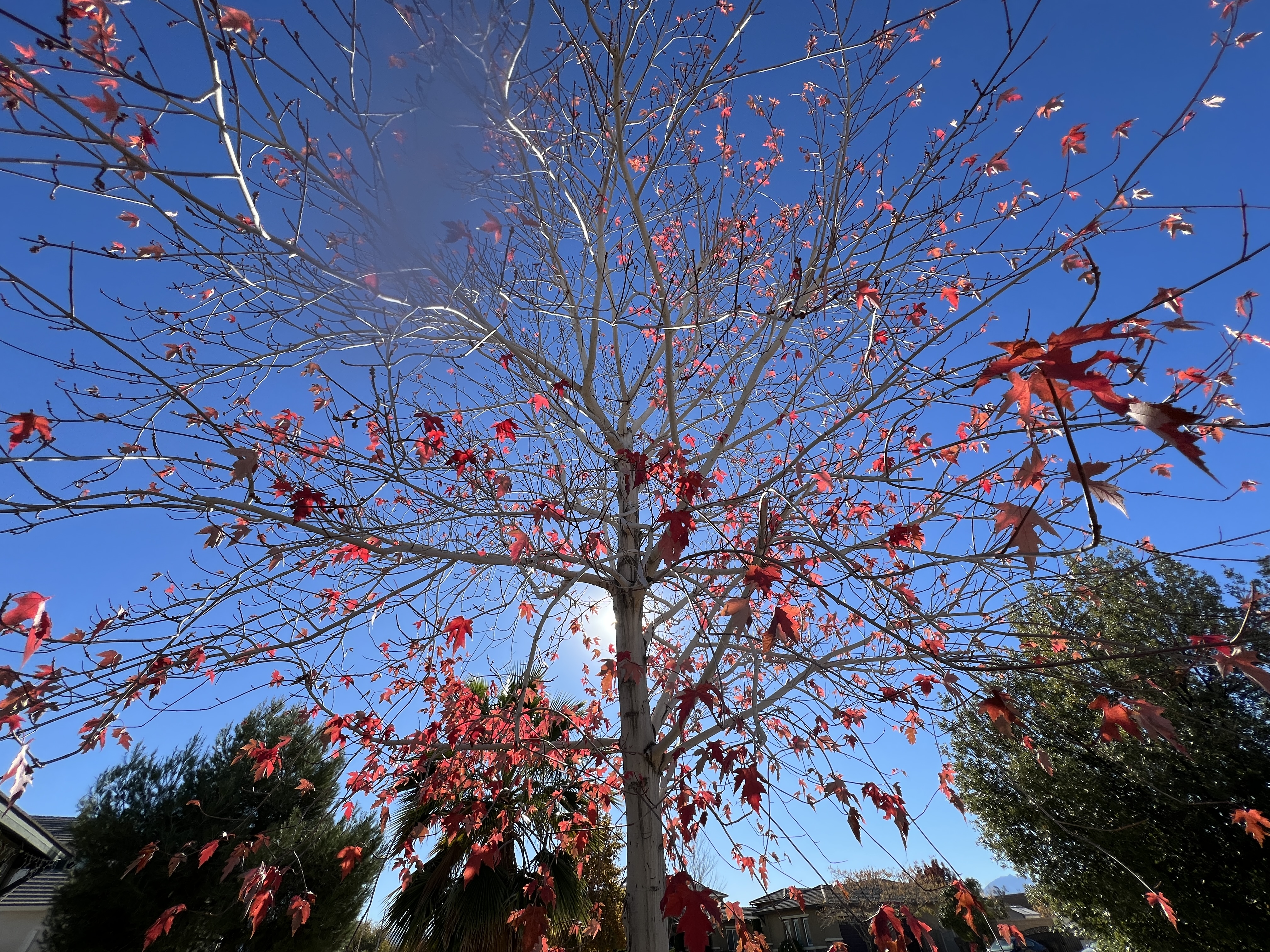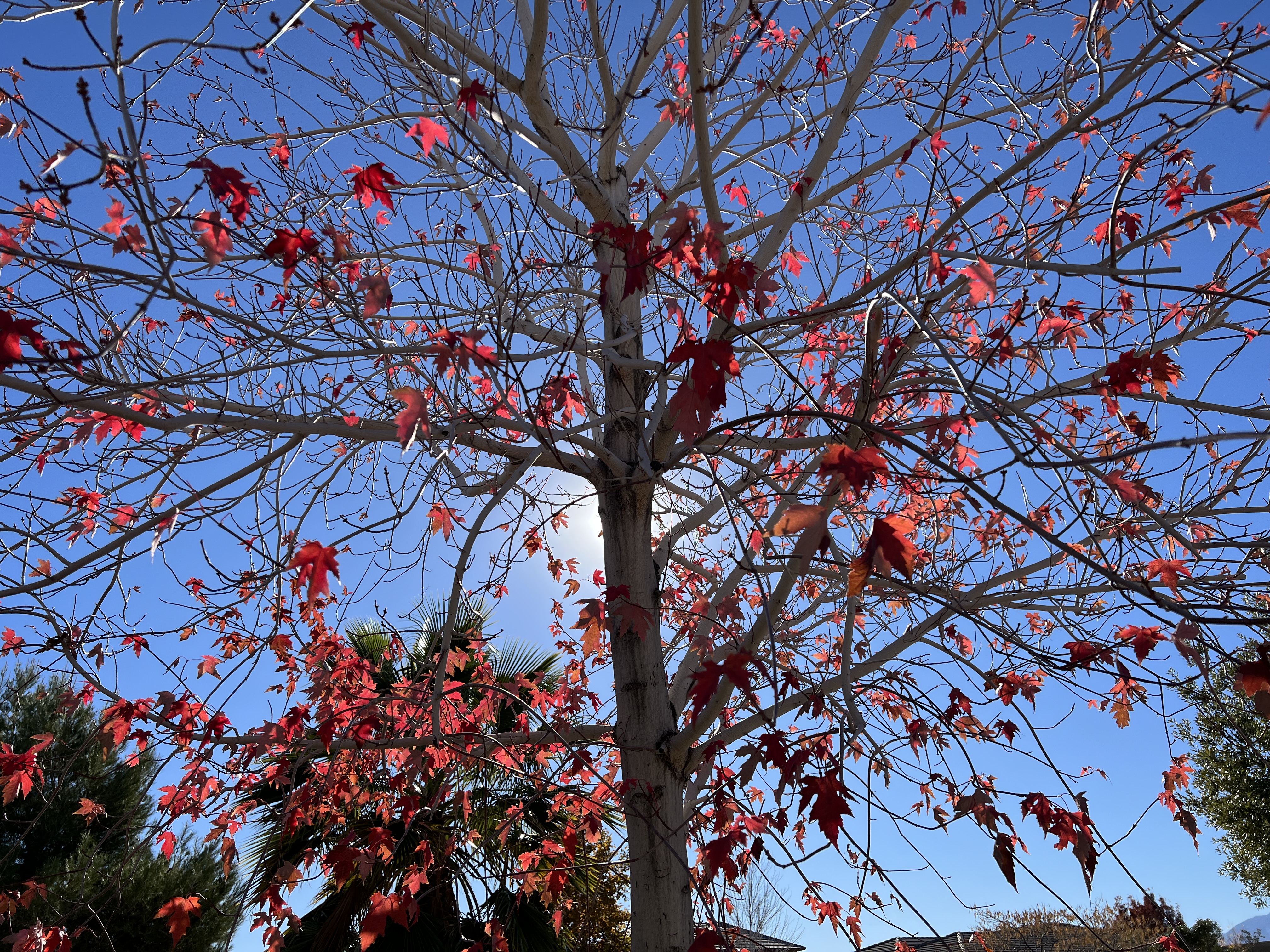 It was a joy watching the leaves on our front yard maple tree turn bright red. (See here and here, for example.)