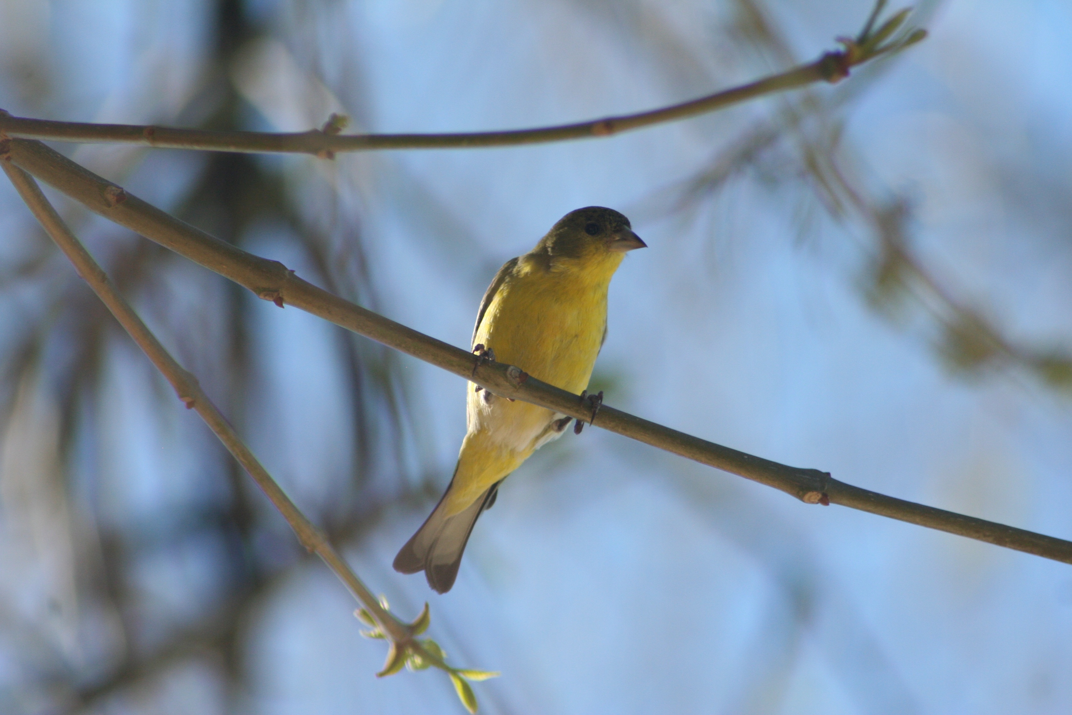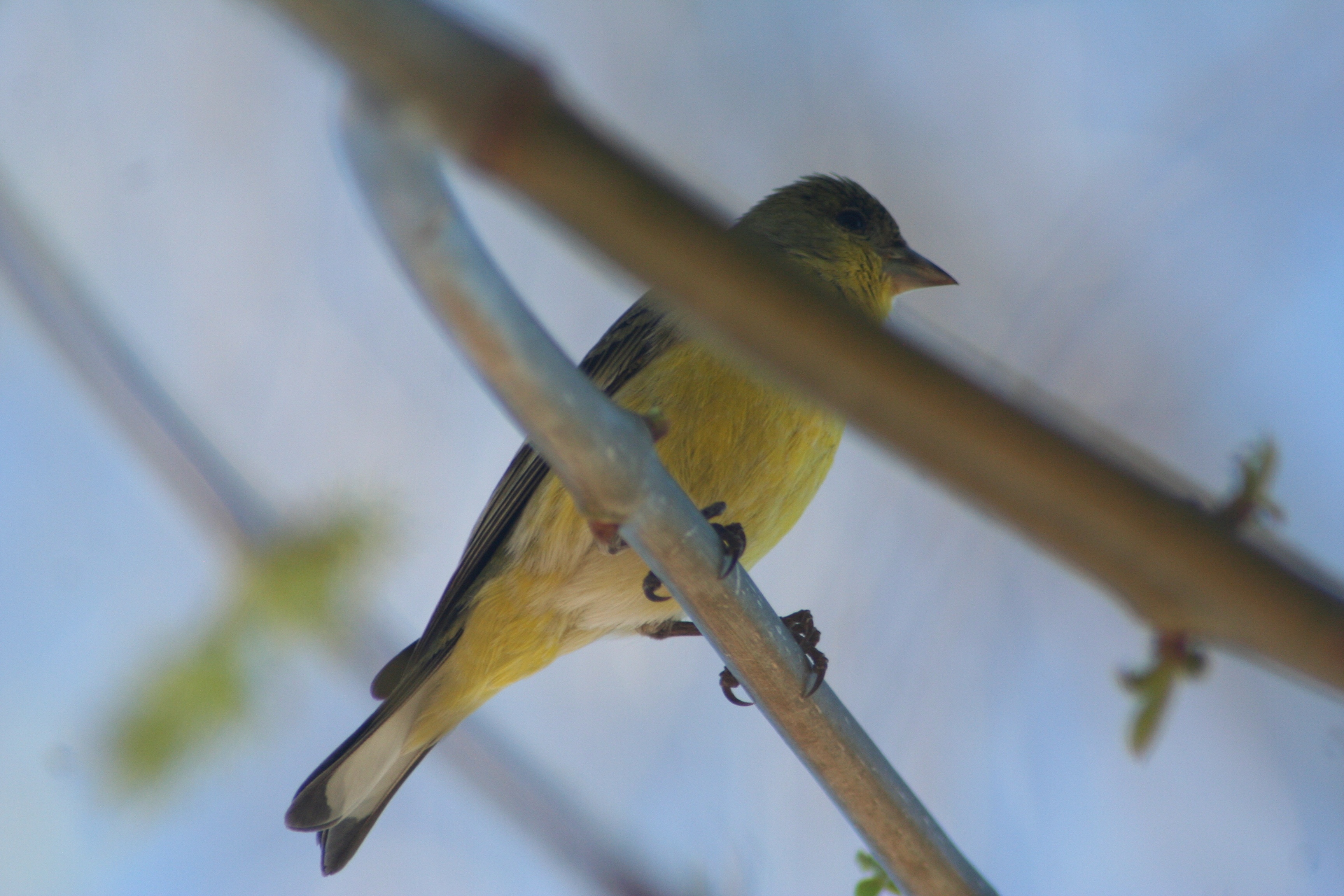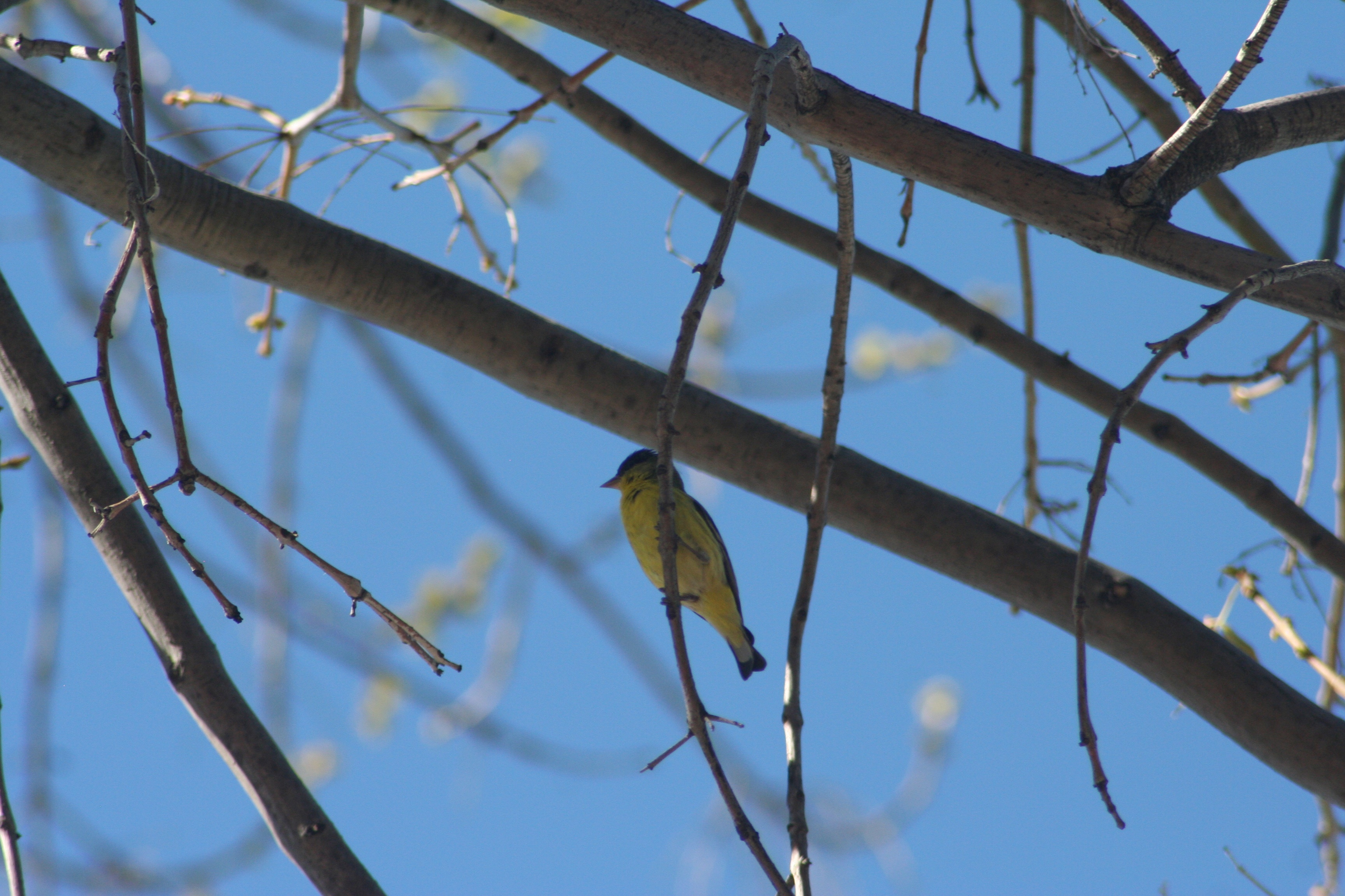 Meet the Lesser Goldfinch. I think the “lesser” part refers to their size – they’re less than 1/2 the size of the house finches in the yard, so I suspect there’s a bigger cousin (the American Goldfinch) out there someplace.