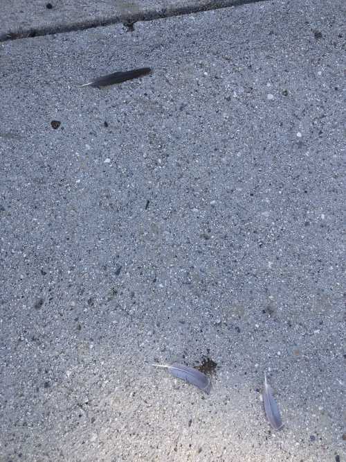 Feathers on the sidewalk. In the flowers. In the dirt.