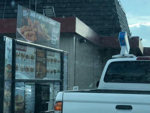 When you’re behind the Domino Pizza delivery guy – at the Jack In The Box drive through…