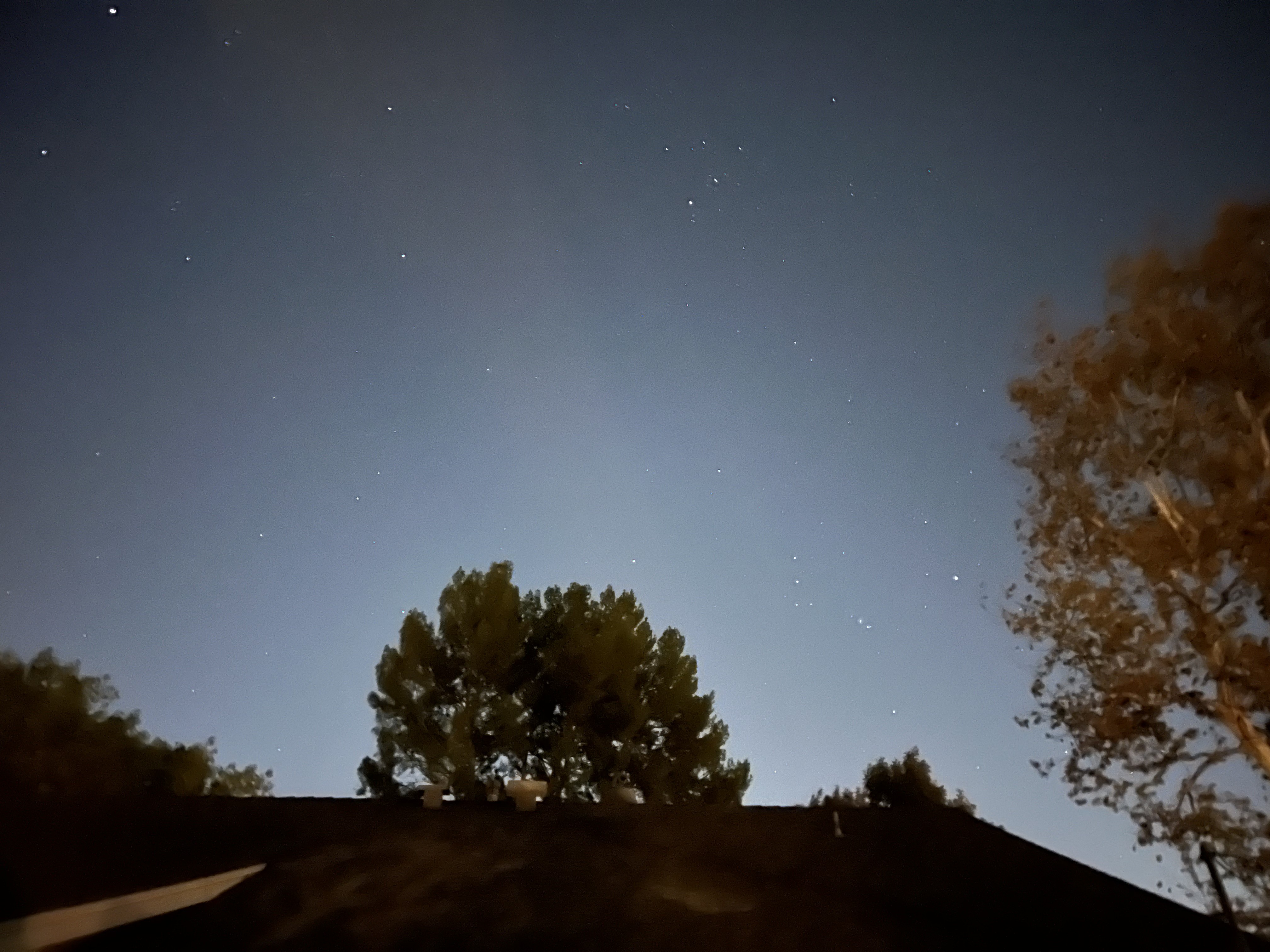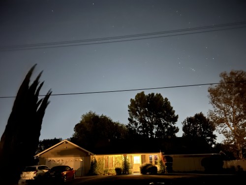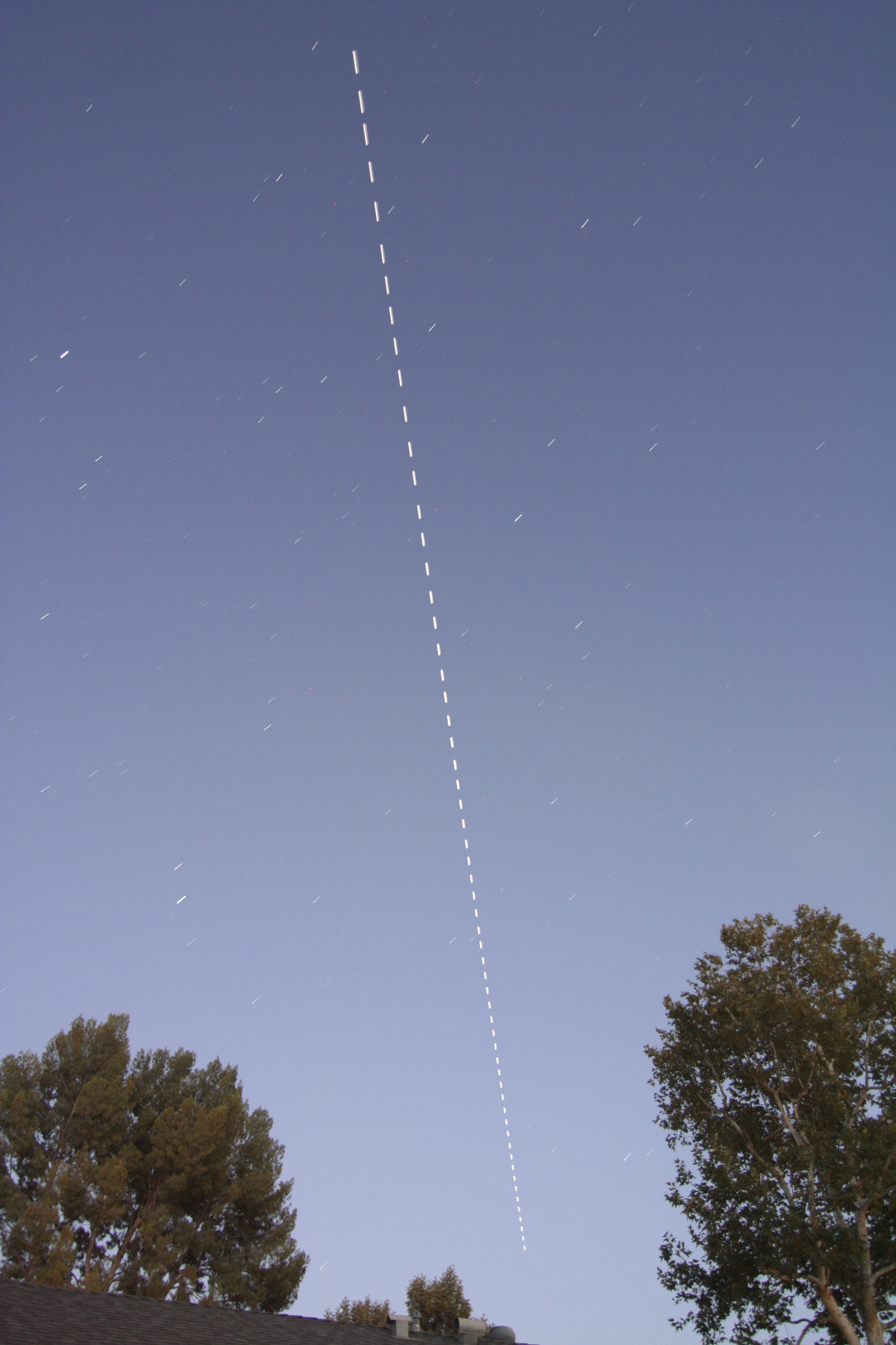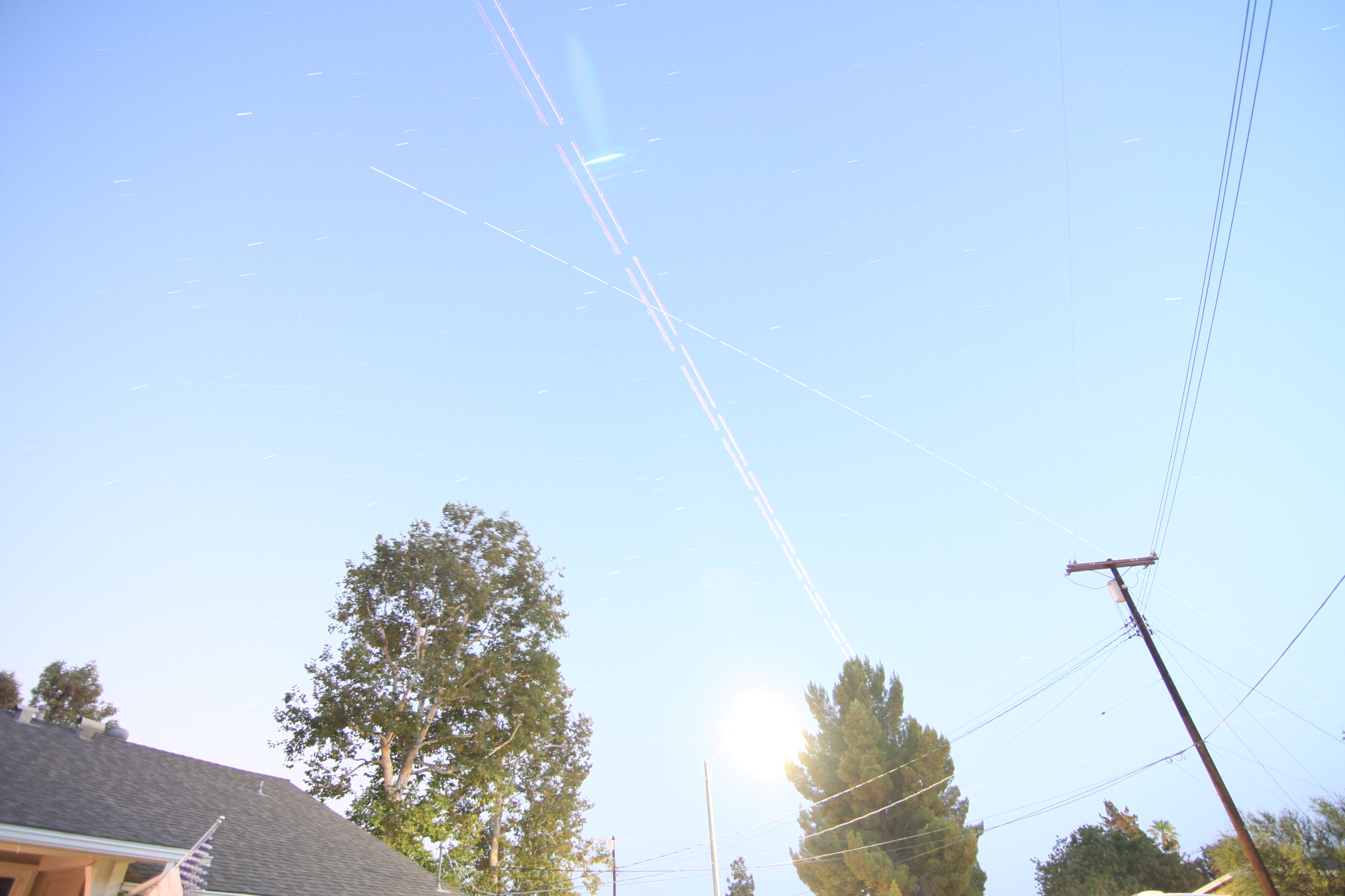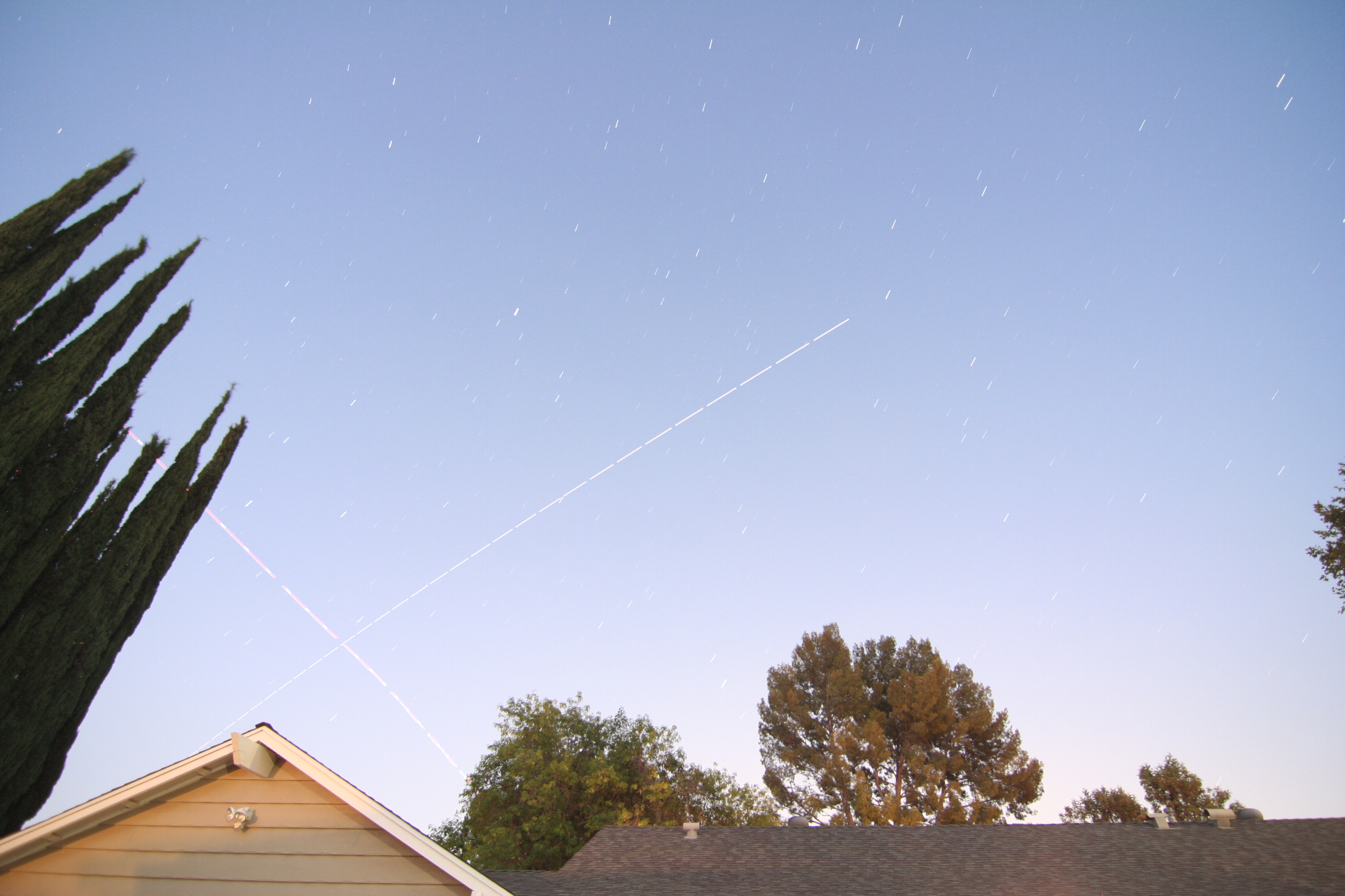 But then it swung through the zenith (center right) and headed down toward the north-northeast horizon (lower left). That sky didn’t have a street light or lens flares in it, and the sky was darker to the east, so the background light didn’t overexpose the frames quite as much. And that plane is unidentified, but it sounded like a Cessna or Cirrus, probably out of Van Nuys.