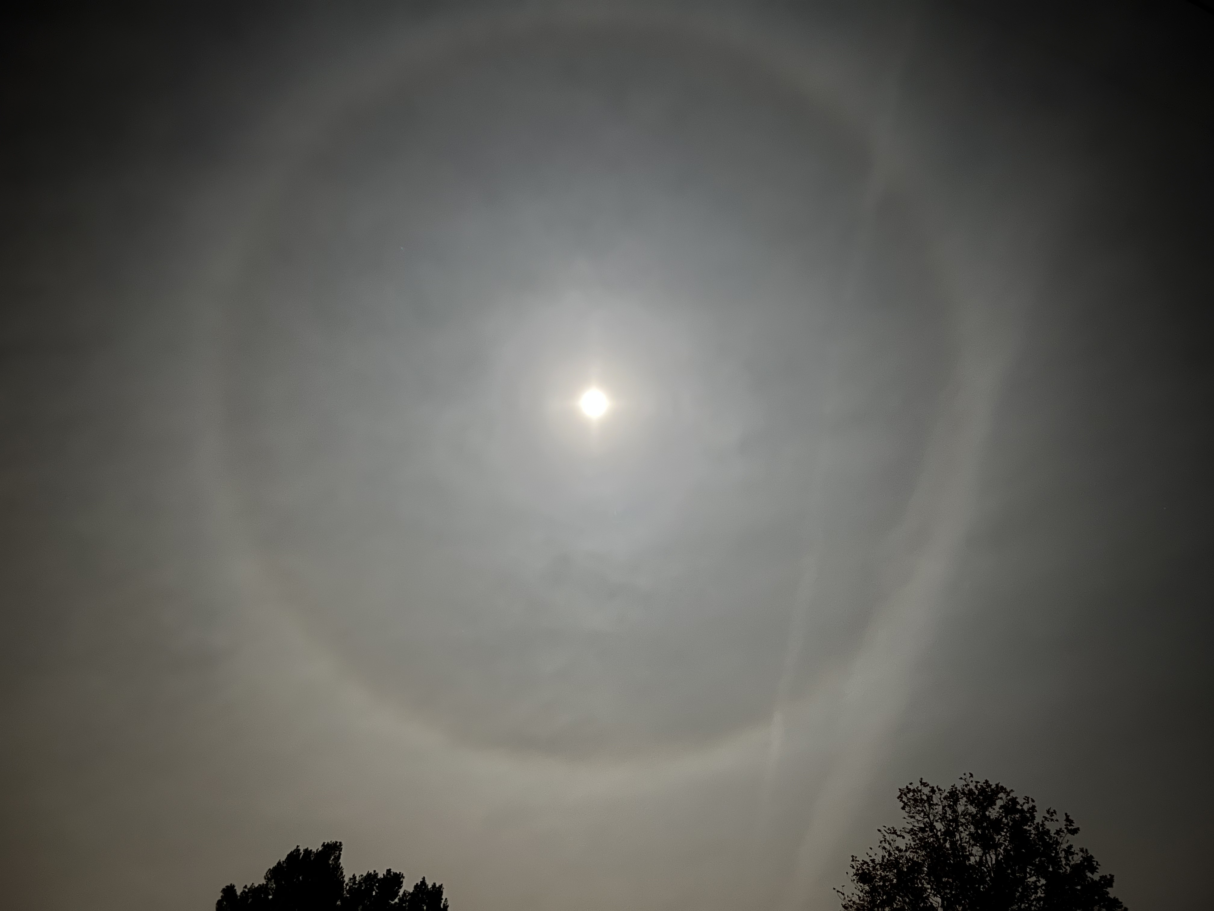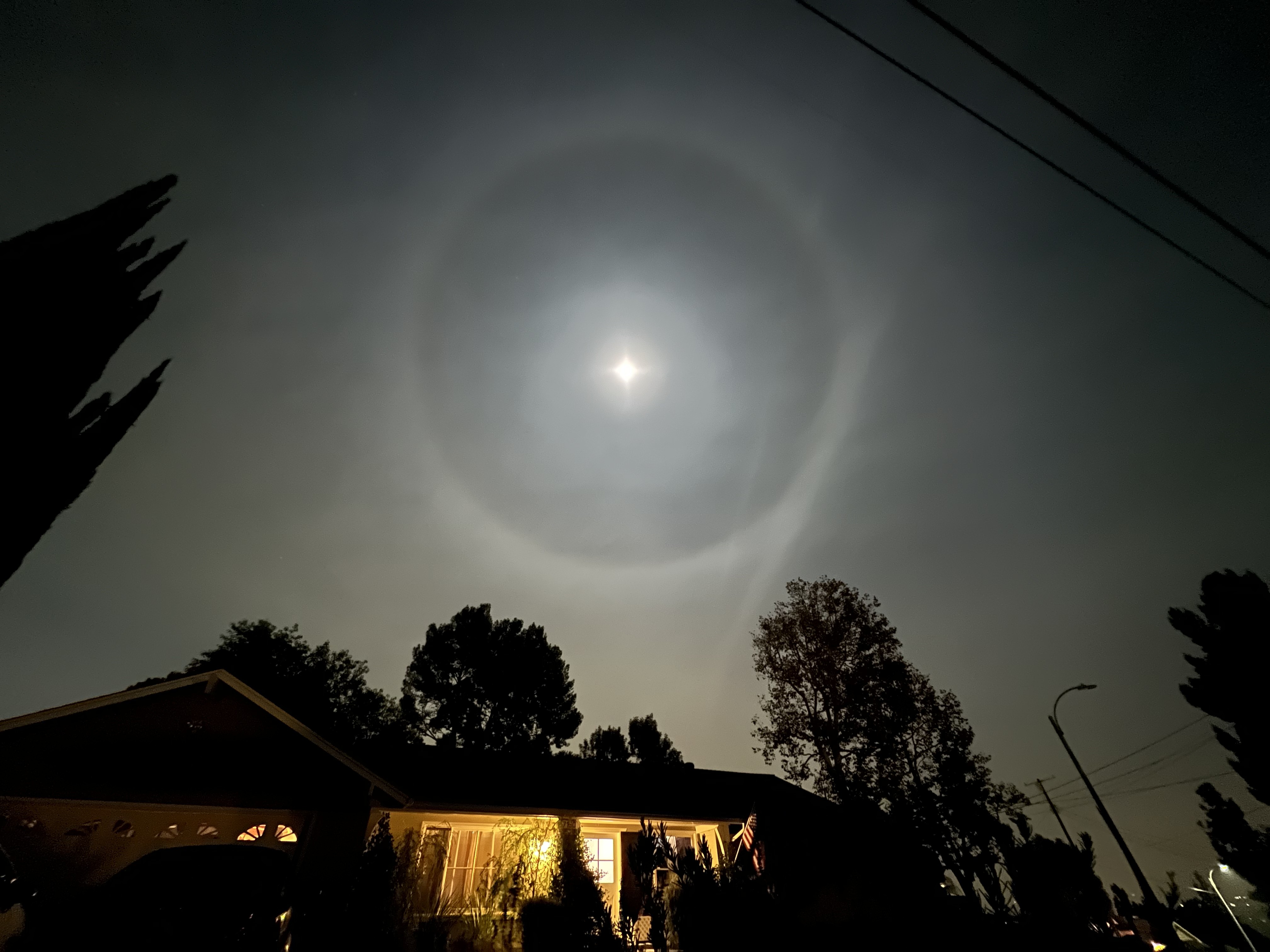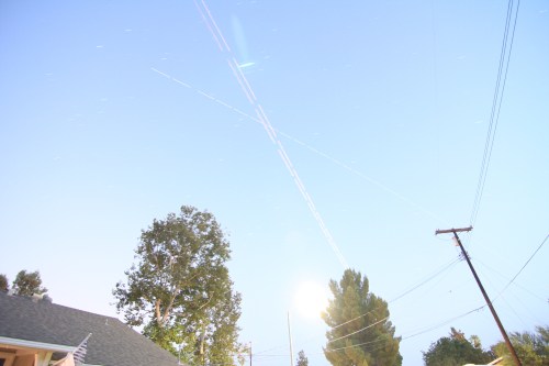 It came up from the south-southwest (lower right, behind the telephone pole) and headed close to the zenith (i.e., directly overhead). One problem is that honkin’ big streetlight right there, which in turn caused caused those UFO-looking lens flares at the top. They’re reflections, not UFOs, which I guess makes them IFOs.